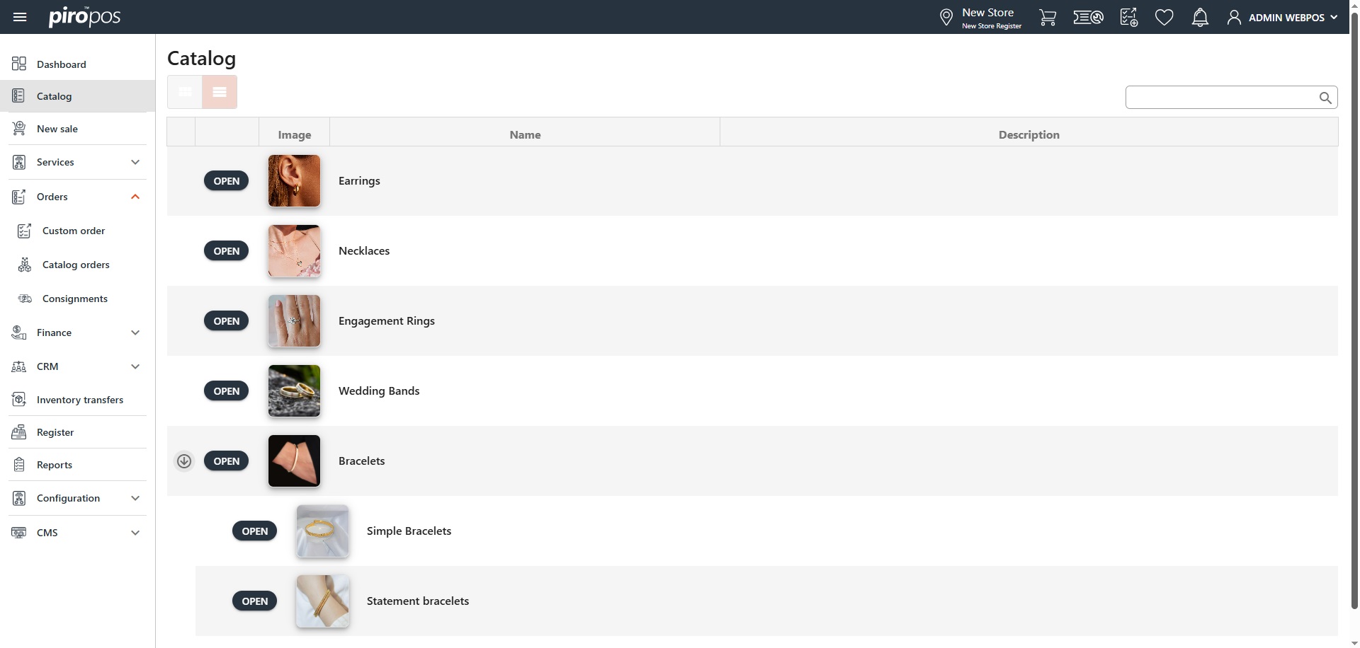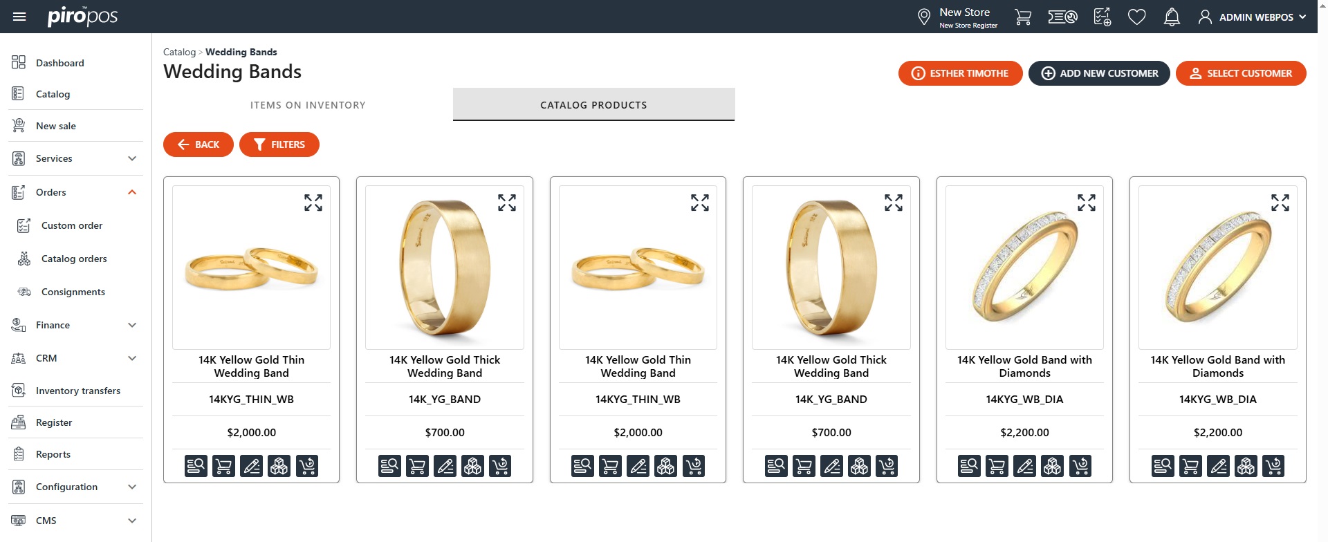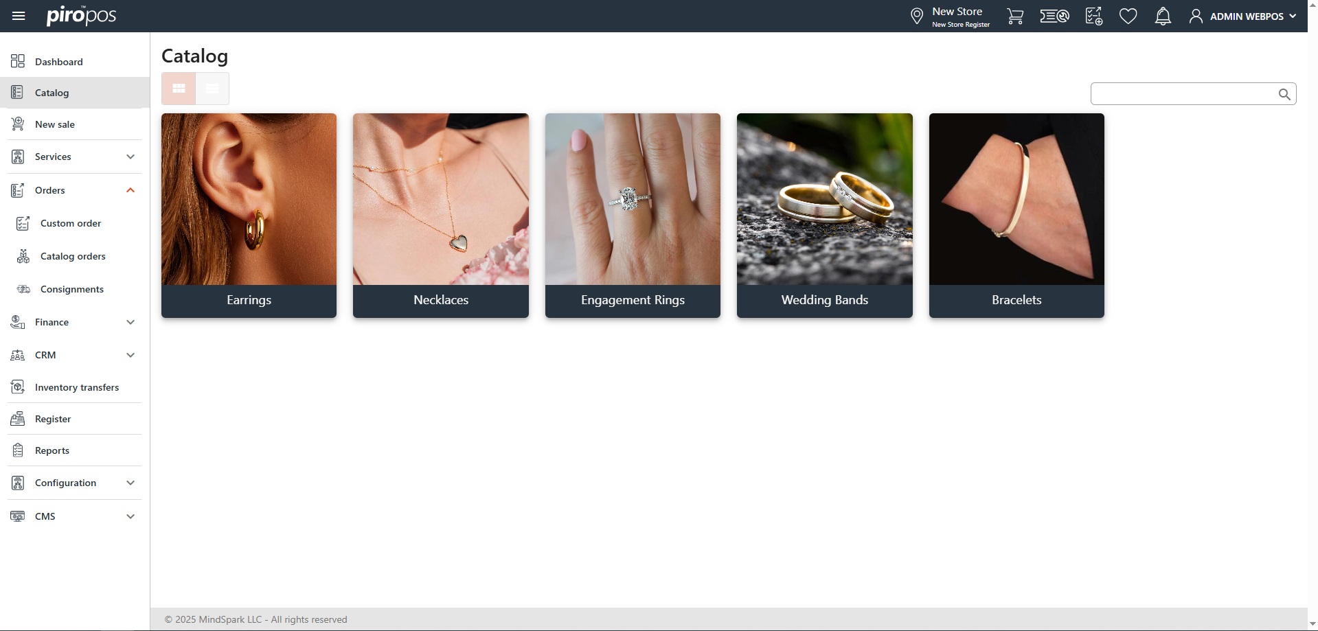 - CATALOG PRODUCTS: this tab shows item types (products) only within that category, the items on inventory will be visible by clicking on one. Every item on inventory will be displayed here as a card depending on their groups’ Inventory item grouping settings.