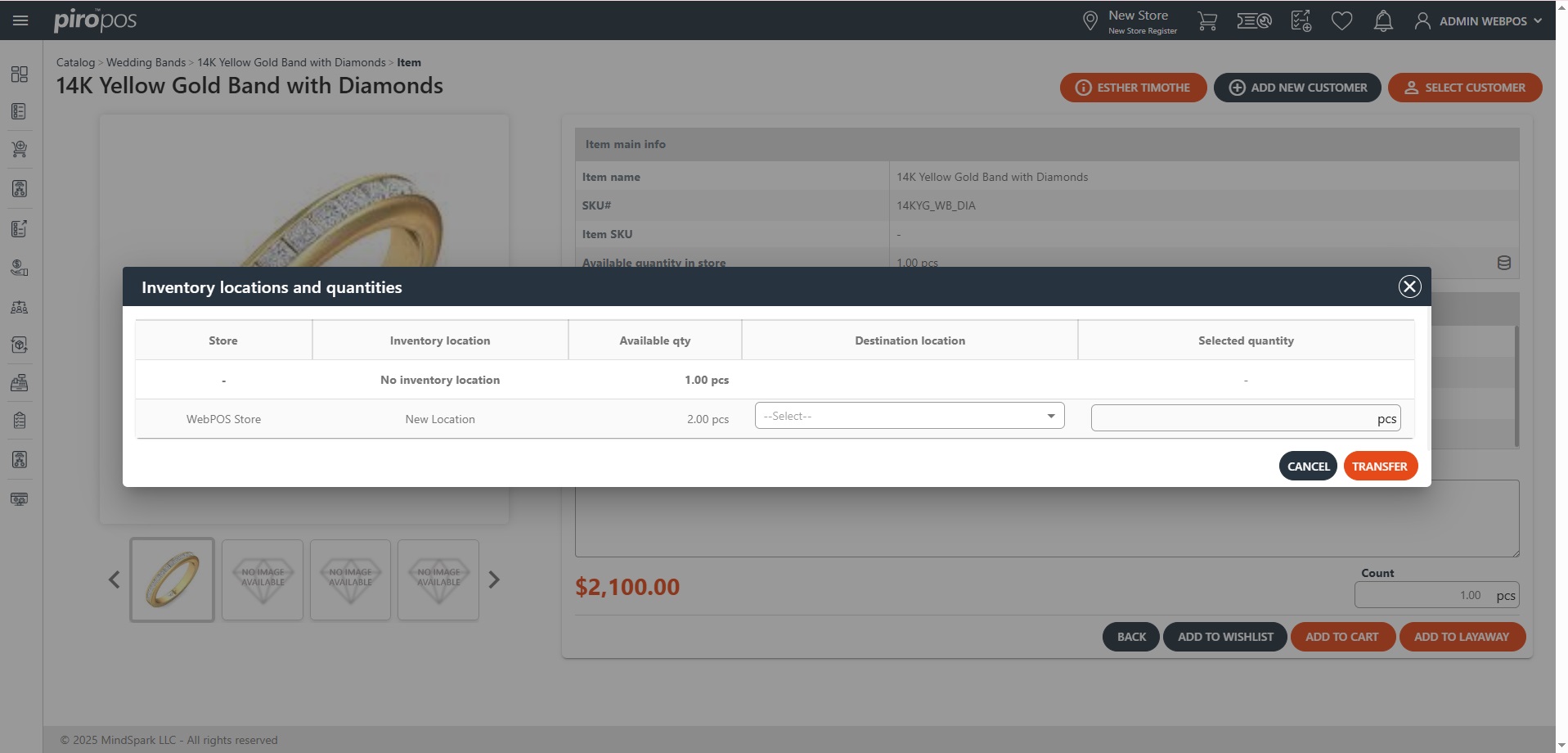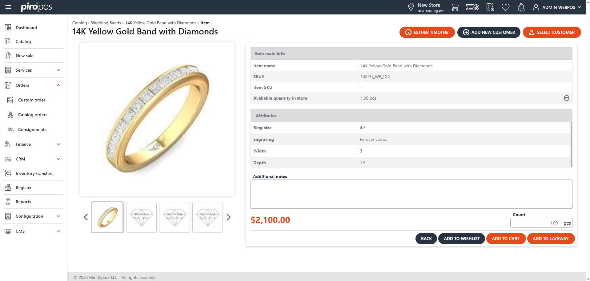 Choose an item by clicking on it. From the detail screen, the item can be saved to the cart with the ADD TO CART or to a layaway with the ADD TO LAYAWAY button. If a customer has already been selected, the product can be added to their wishlist with the ADD TO WISHLIST button and it’s possible to sell it later.