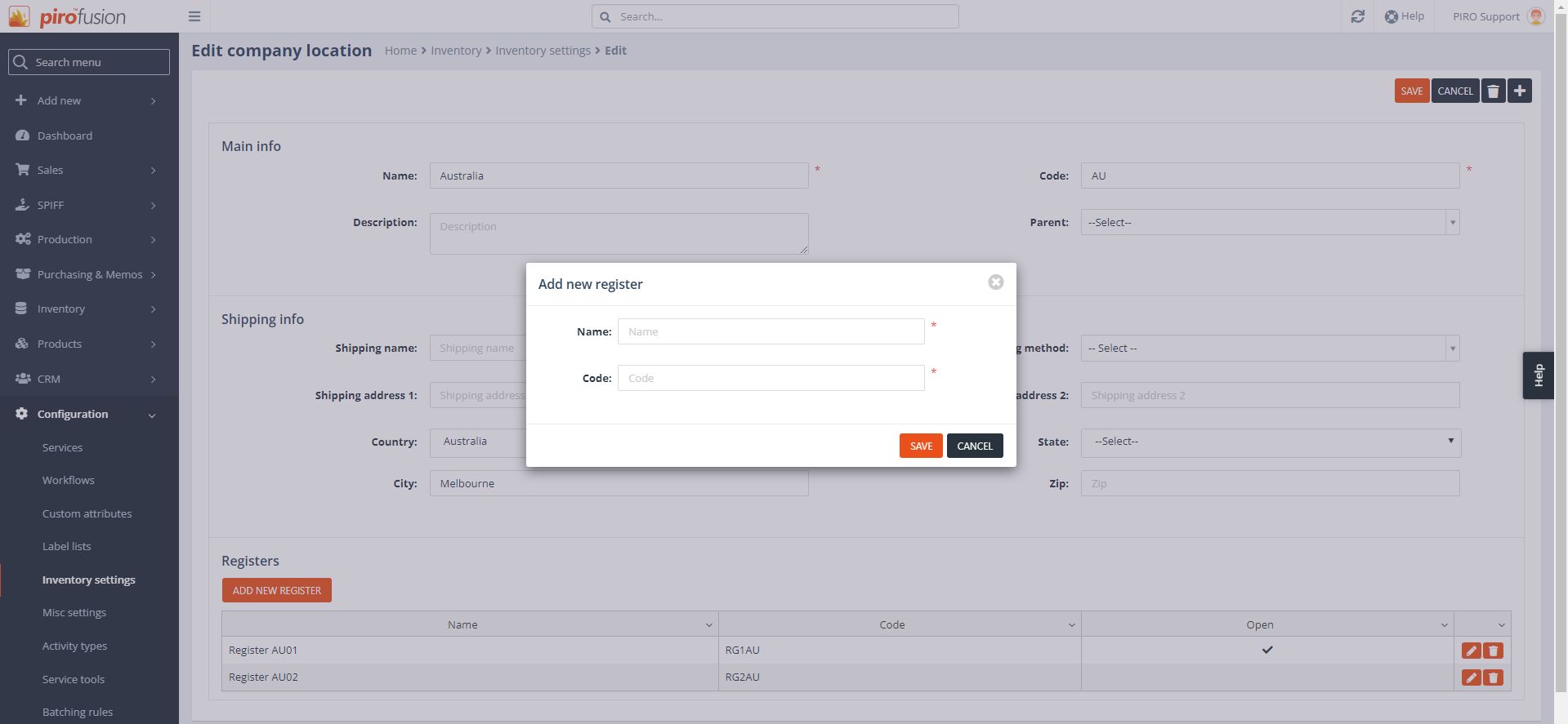 Add the Name and Code for the new register at the end of the Edit Company Location page by clicking the ADD NEW REGISTER button.