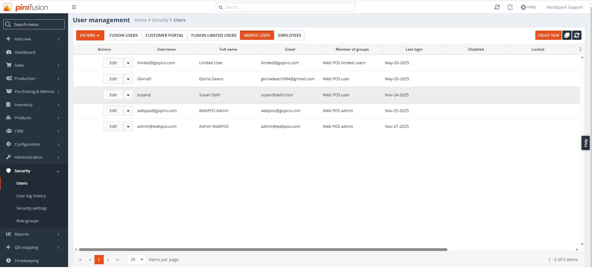 At the module level we can control what different users can view and edit, and this setting is available for all modules. Everything described in this guide assumes that the user has full admin rights in the POS. Users are managed from the back-office system. To set up users who can access PIRO Retail, navigate to the back-office Security module and select the Users submodule. Choose WEBPOS USERS tab then click the Create New button on the User Management page.