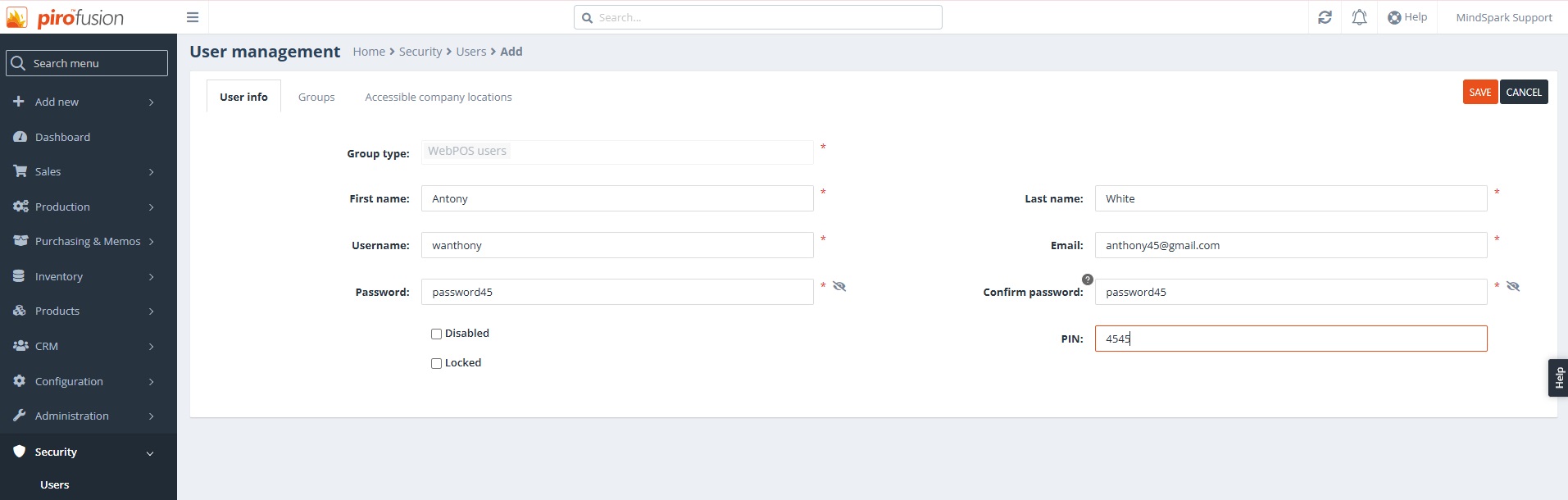 Enter the information about your PIRO Retail users in the first tab of this window – User info. Your users need to have a password and/or a PIN code for signing in to the system. Choose a user group on the second tab: