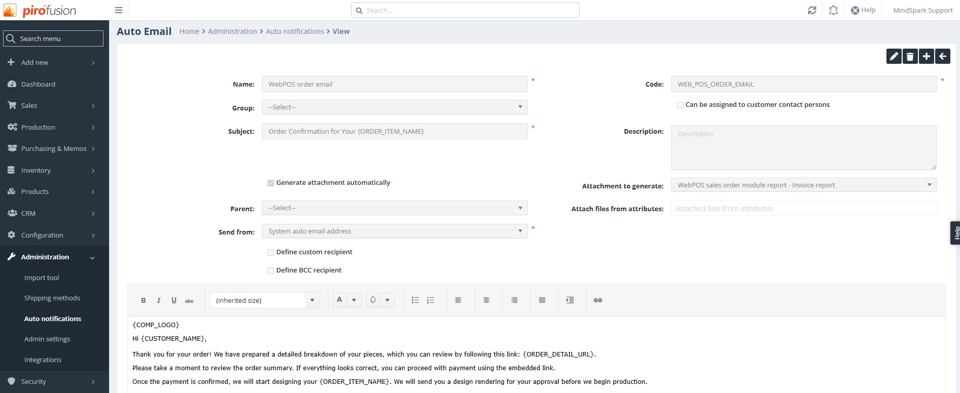 The third icon opens up an email preview that content can be set up in PIRO Fusion – Administration – Auto notifications: