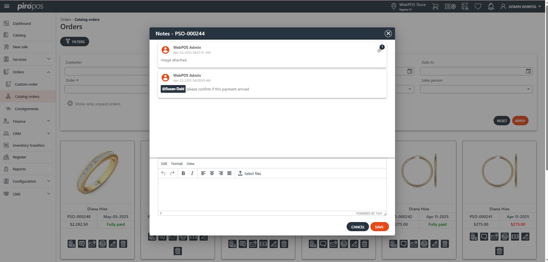 Each order card has six or seven icons. The first icon opens the Sales commissions dialog, where commission percentage can be added. The second icon opens the Notes dialog, allowing you to add order-related notes. You can also indicate other users when adding attachments in the notes: