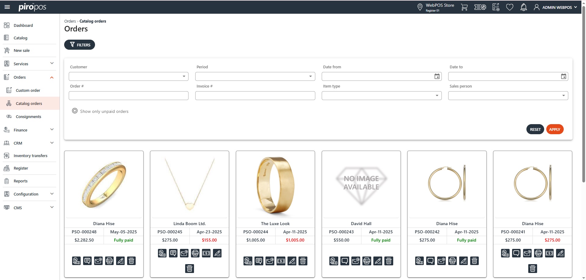 The Catalog orders submodule from the main Orders module shows all existing catalog orders as visual cards. If you have an extensive order history, the filters will make it easier to find the specific order you are looking for. You can filter by customer, date range, order and invoice number, item type and sales person.