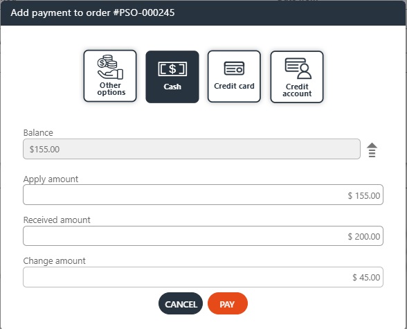 The ‘Pay’ icon appears only on orders that have not been fully paid and opens the Add payment dialog up, where additional payments can be recorded. By selecting the arrow icon next to the Balance field, the full payment amount will appear in the Apply amount field. It is also possible to make a partial payment: