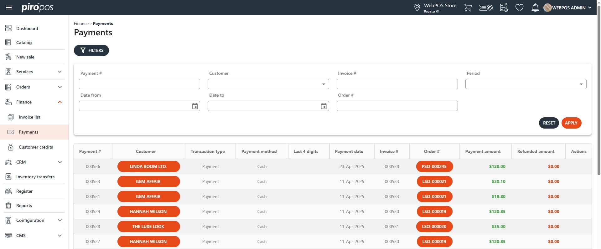 This module lets users search for past payments and view the associated customers and orders. Payments can be filtered by payment code, customer, invoice, predefined or specific time periods, and by order code.