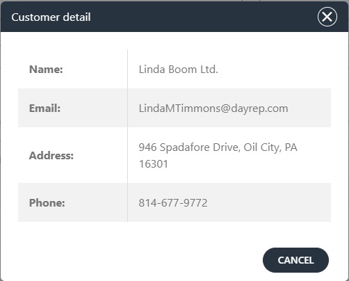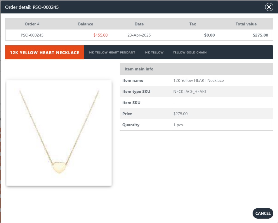 By clicking on the order code, you can view the selected order’s details, including its code, balance, creation date, tax amount, and total value. The order items and sub-items are also displayed with their names, SKU numbers, prices, and quantities: