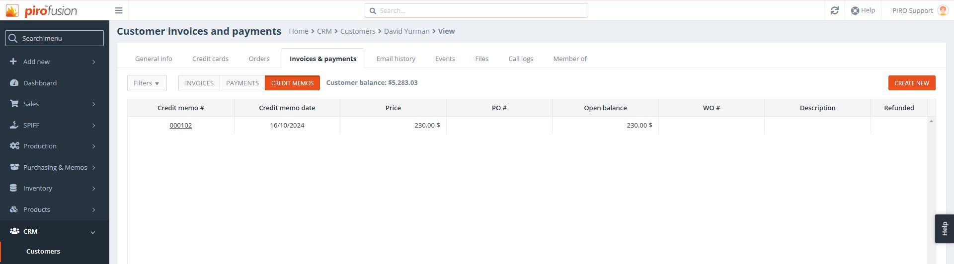 Alternatively, you can access this information through the CRM menu. Navigate to the customer details, select the ‘Invoices and Payments’ tab, and then click on the ‘Credit Memos’ sub-tab to view the customer’s credit memos and refund statuses.