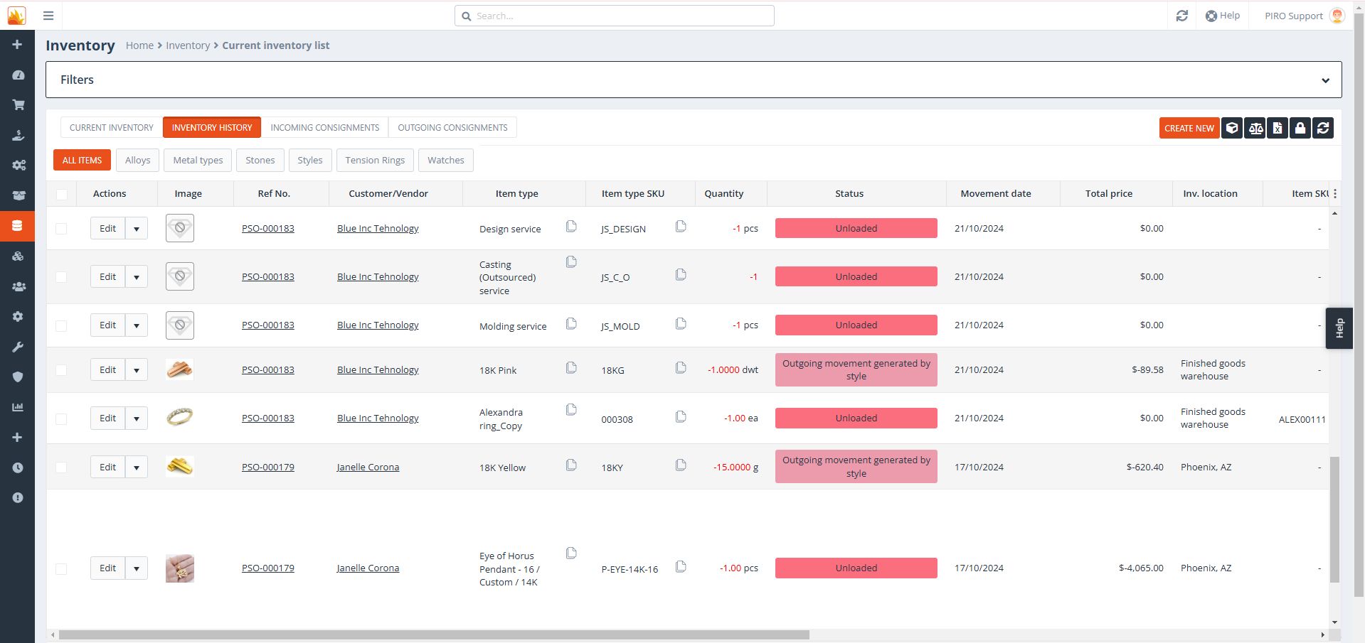 If an order is created in PIRO Retail, the corresponding item(s) are automatically removed from the inventory in the Back-office system, with their movements marked as ‘Unloaded’:
