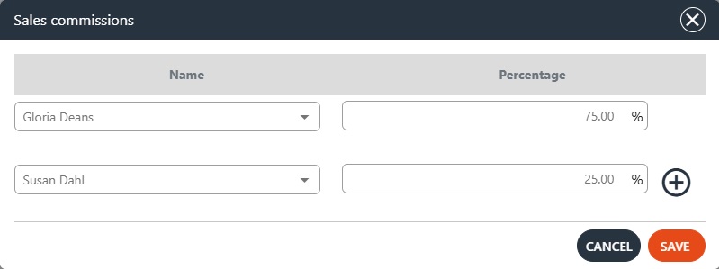 Select the salesperson’s name from the first drop-down and enter the percentage in the second field. Click the ‘+’ icon to add another salesperson to the sales commission dialog — the percentage will be evenly divided among them.